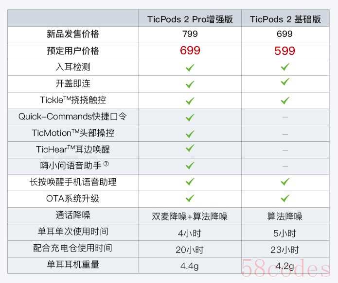 售价方面,TicPods 2基础版售价699元,TicPods 2 Pro增强版售价799元,预售期内均提供1月定金抵101元优惠。