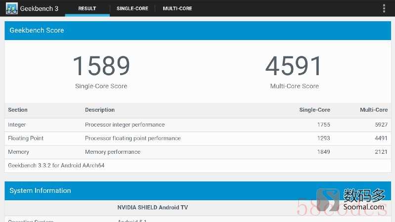 英伟达 nVIDIA Shield TV - 性能测试 - 《Geekbench 3》处理器理论性能测试