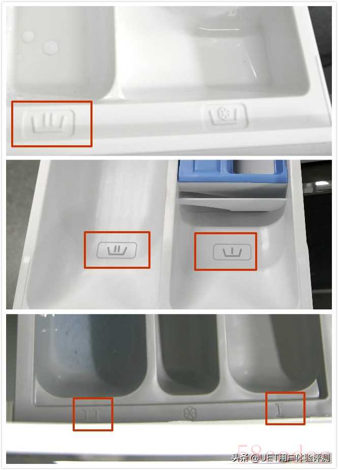 如果洗衣机的洗涤剂盒采用图标区分,那么颗粒代表洗衣粉添加口,液体代表洗衣液添加口,小雪花代表柔顺剂添加口。总体来说,还是比较形象直观的。
