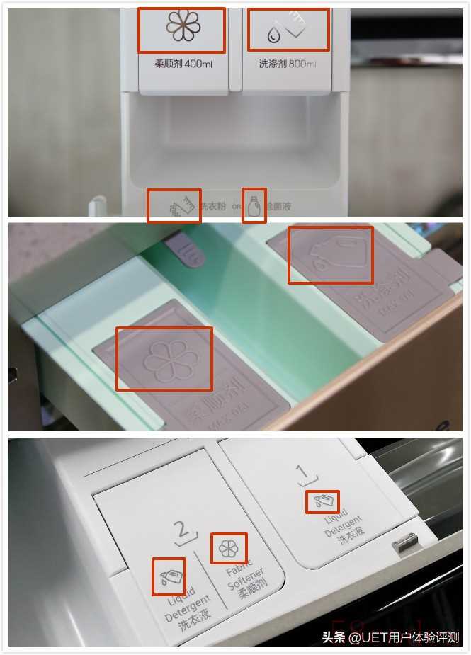 当然,目前比较高端的滚筒洗衣机还加入了洗涤剂自动投放功能,其洗涤剂盒的设计也略有不同,如下图所示: