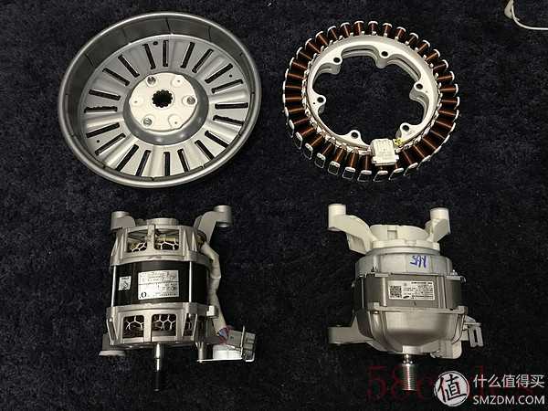 DD直驱电机:最上面的,定子和转子分开拍照的,直接驱动内筒,不用皮带,也很受大家喜爱,但是随着内筒直径的增加脱水平衡问题也显现的更加明显,找平衡时间长,难脱水,并且占用后部空间难做大容量。