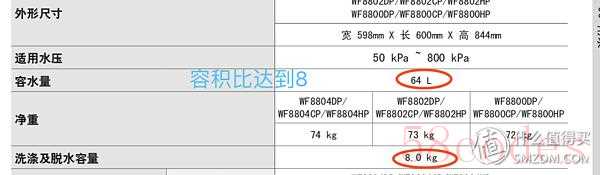 这是十年前一款标注容量为8公斤的滚筒洗衣机,内筒达到了64升的容量,那么用64升除以8kg,容积比就是8,也就是1公斤的衣服提供了8L的体积。