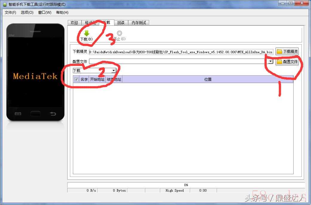 第一步选择刷机引导文件,如下图,点击确定后,刷机的镜像文件就加载到啦MTK刷机工具里面。一般情况,我们看上图默认的是下载模式,里面还有格式化下载,升级模式,从中切换,有的手机需要使用升级模式来刷机,大多数是默认的下载模式就可以了。选错模式刷机会报错,mtk放心的刷,刷不死,vivo系列不能用这个刷,百分之百报错,后黑屏不开机。