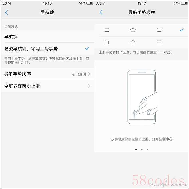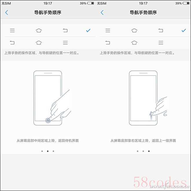 vivo X20的全面屏压缩了下边框的空间,所以最近任务、Home和返回键就只能占用屏幕最下面的一行空间了。考虑到很多童鞋会觉得这会破坏全面屏视界的整体感,浪费了宝贵的屏幕空间资源。所以,该产品引入了隐藏导航键,同时启动上滑手势的功能: