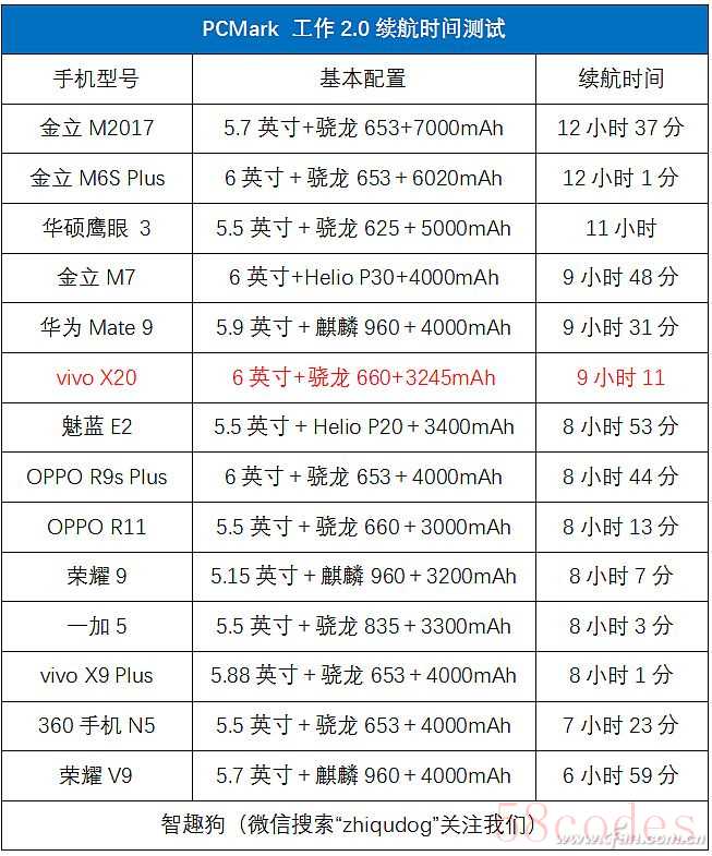 得益于骁龙660优秀的能耗比以及AMOLED屏幕的省电优势,vivo X20在搭配3245mAh电池的前提下在PCMark续航2.0测试中也取得了超过9小时的续航能力,表现不错。