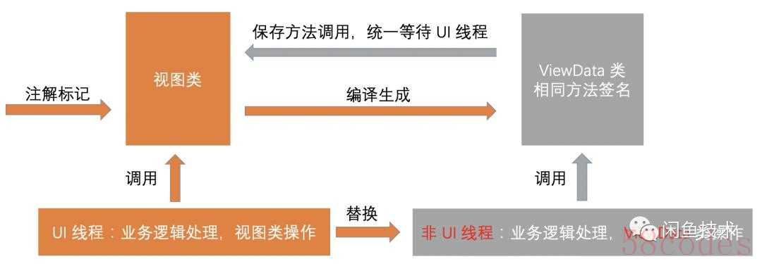 核心思路:编译期根据视图类自动生成 ViewData 类,并替换视图类实例。ViewData 类和视图类拥有相同的关键方法签名,方法执行时记录视图操作,统一切换到 UI 线程执行视图操作。