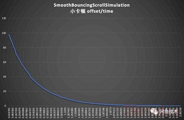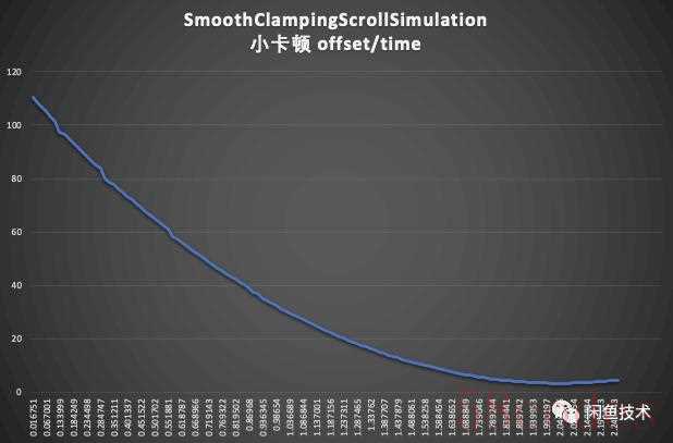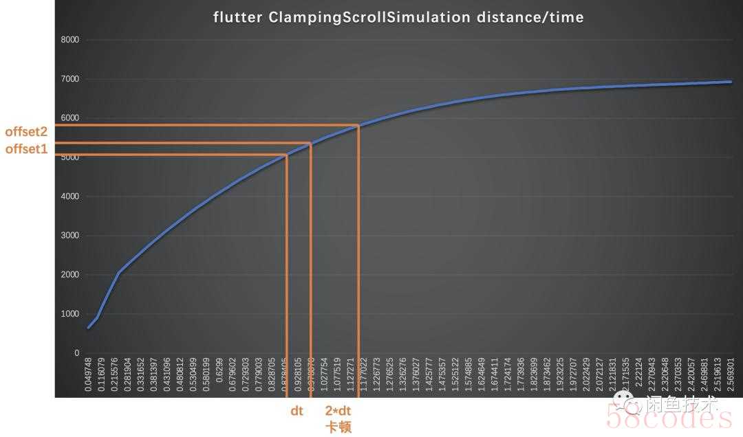 查看 flutter 滑动算法,可以发现是基于一条 D/T 曲线计算滑动距离,所以发生卡顿时,输入 timeOffset 值发生翻倍,最终计算出来的 offset 值发生近乎翻倍。