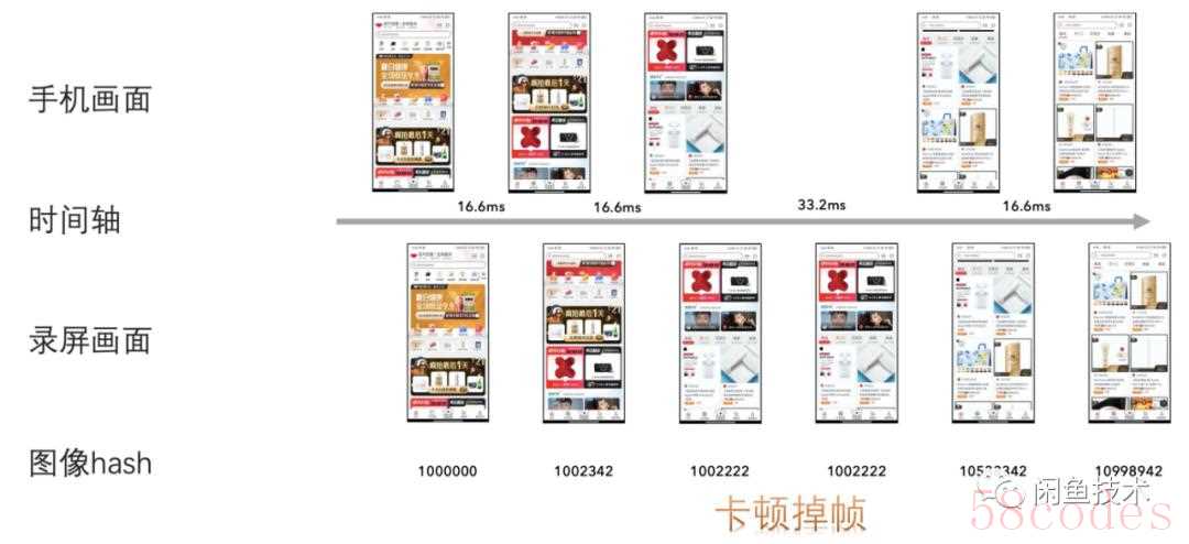 我们从 APP 录屏画面入手,计算流畅度指标值。当我们得到 APP 滑动过程中的录屏数据,可通过每 16.6ms 检测录屏画面是否发生变化,当连续画面未发生变化,则表示发生了卡顿。无变化的连续画面数则表示了卡顿的时长。