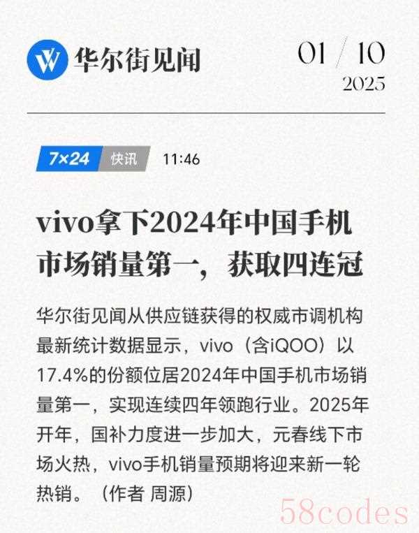 【CNMO科技消息】1月9日,CNMO获悉,根据权威市场调研机构的数据,vivo(含iQOO)在2024年全年以17.4%的市场份额夺得中国手机市场销量榜首,成为国内首个实现销量“四连冠”的手机品牌。随着2025年初国家补贴力度的增强,元旦至春节期间的线下市场热闹非凡,vivo手机销量预计将迎来新一轮的增长热潮。