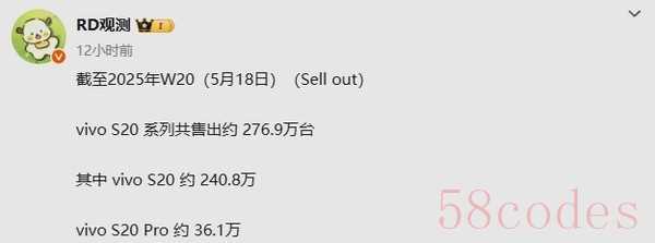 根据上述博主提供的数据,截至2025年5月18日,vivo S20系列共售出约276.9万台。其中,vivo S20约为240.8万台,vivo S20 Pro约为36.1万,两款手机的销量占比分别约为87%和13%。