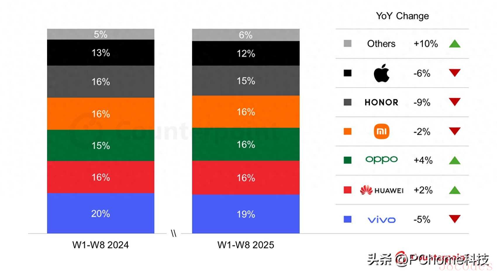 从市场份额来看,华为、OPPO、小米均以16%的市场份额并列第二梯队,与vivo存在明显差距。其他品牌中,苹果、荣耀、vivo同比销量有所下滑,而OPPO、华为以及其他品牌则实现同比增长,其中其他品牌同比增幅达到10%,展现出一定的市场活力。