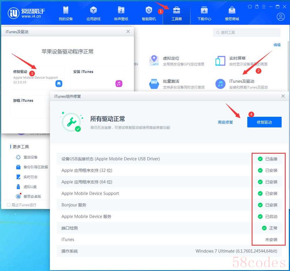 1.按如下方法检查你已安装好的爱思助手,查看以下标红位置的驱动是否如下图所示安装成功;