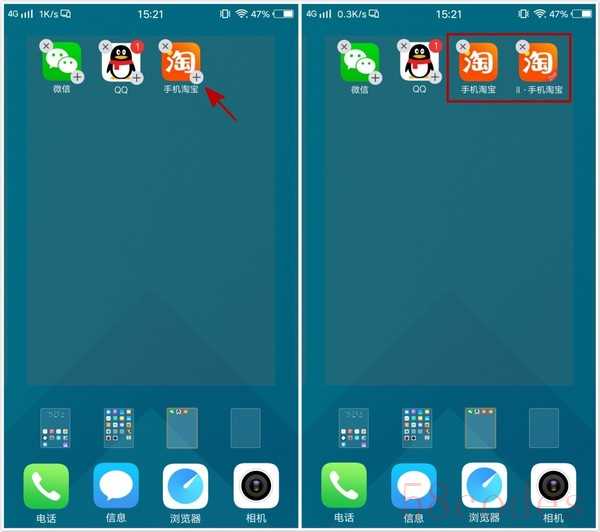 vivo的应用分身设置起来也非常方便,打开vivo X9s的“设置”,在设置的选项中找到“应用分身”,再将“显示分身”按钮打开即可;返回桌面后,长按应用,图标的右下角就会出现“+ ”号标识,点击“+”号,该应用便成功分身,随后就可以体验应用一分为二的便捷了。