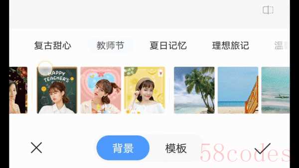 完成对人物的调整后,点击「换背景」功能。N种背景样式,可甜可盐风格、趣味夏日等模板任你挑选。