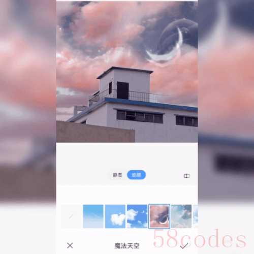 除了静态的天空,还能让天空动起来~点击「动感」按钮后,滑动屏幕可以改变天空移动方向。调整到自己喜欢的感觉后,点击保存就自动生成视频了~