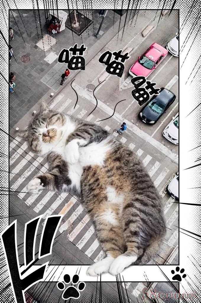制作一张脑洞大开的喵星人入侵城市照。首先找到一张猫咪在仰着睡觉的图片。抠完图之后找到对应的背景模板。可以自由调整猫咪的大小和位置。