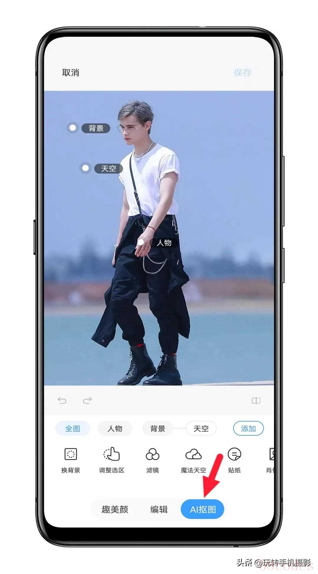 如果图片符合以上要求,那么进入AI抠图页面后,手机会通过AI算法自动识别出主体、背景等内容。而换背景这种高级的图片处理功能,这里都有!