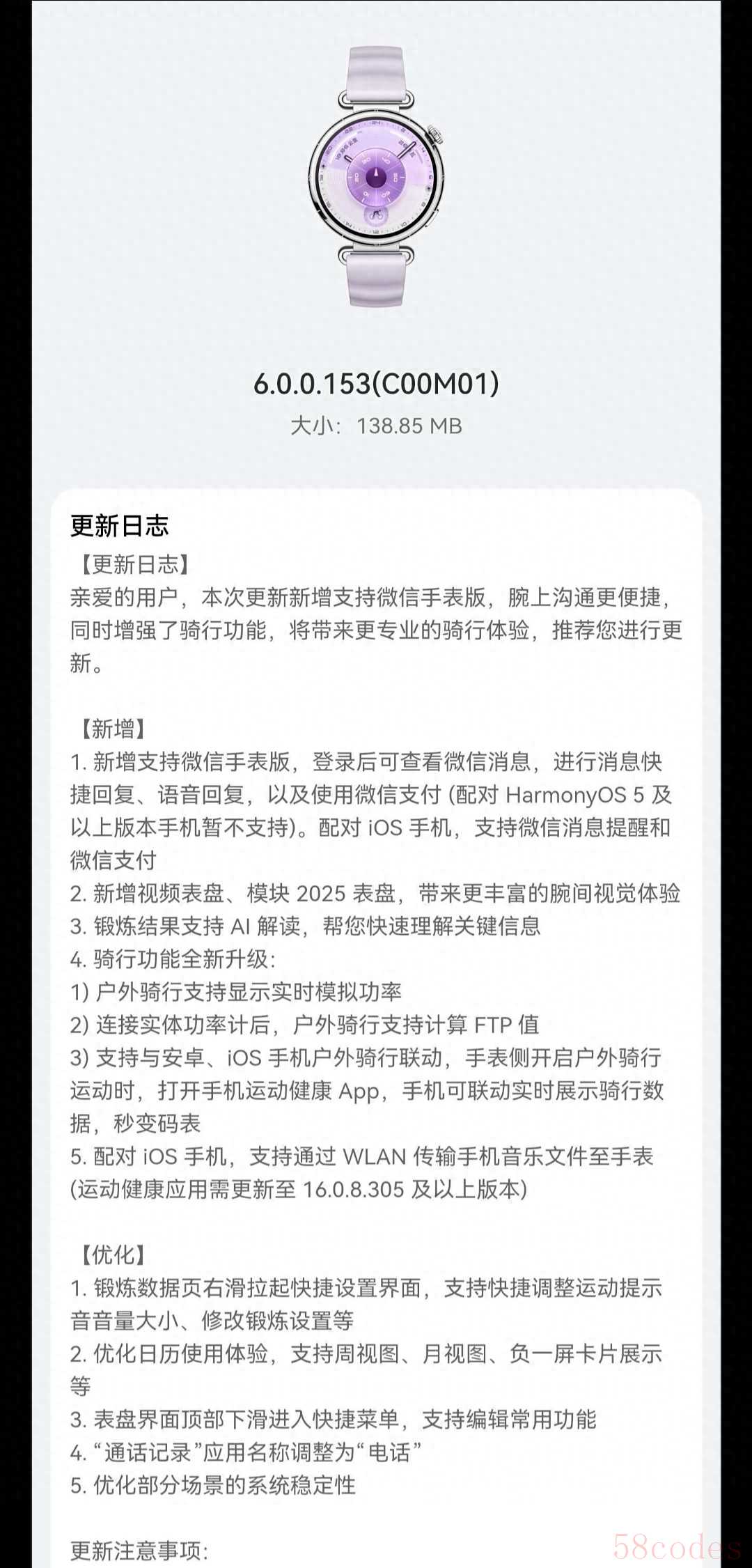 9月29日10:08,华为WATCH GT 6正式开启首销,不少首批入手的用户很快就收到了HarmonyOS 6.0.0.153版本更新提示,此次更新包大小约138.85MB,带来的功能升级直接贴合日常使用需求。