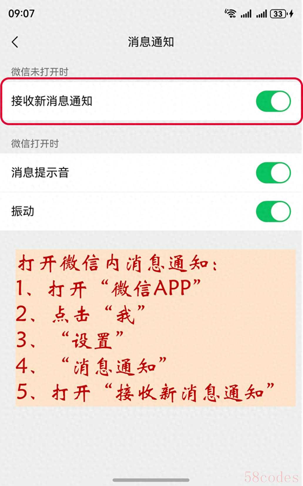 微信App内:打开微信,进入「我」-「设置」-「消息通知」-打开「接收新消息通知」,确保顶部的“接收新消息通知”是开启状态。