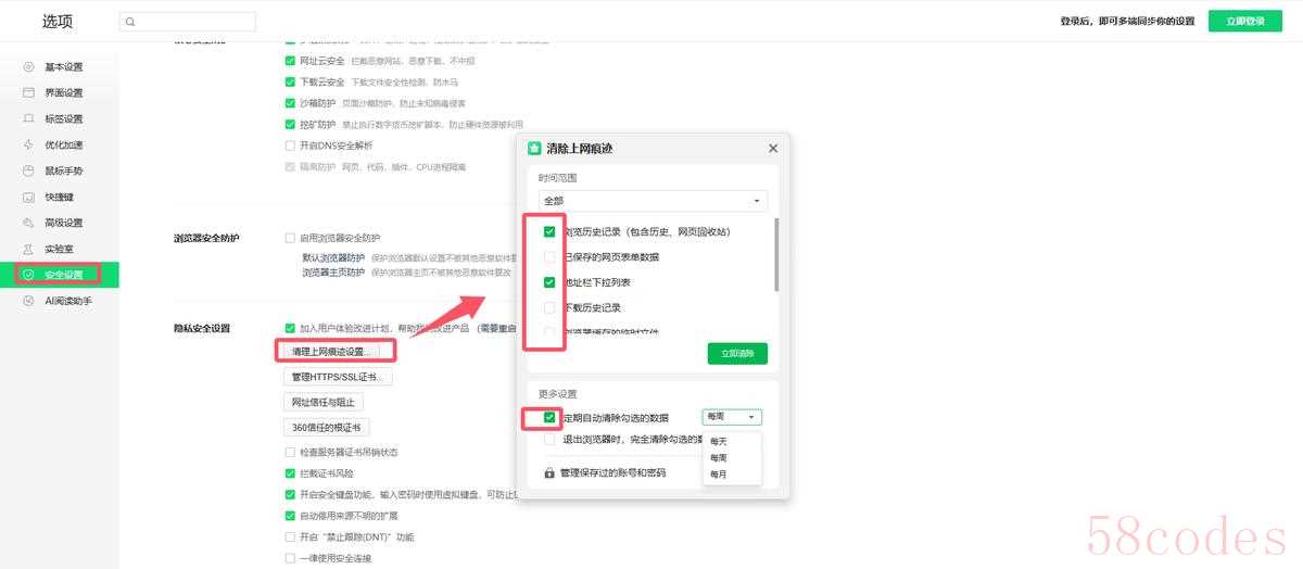 以本人常用的“360安全浏览器”为例说明,打开后先找到“设置”,随后在“安全设置”界面点击“清理上网痕迹设置”,再自主选择Cookies、浏览历史记录、缓存的临时文件等并按下“立即清除”,还支持按天/周/月来定期自动清除。