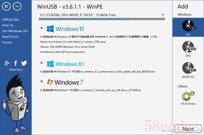 随后点击软件右侧Add栏内的ISO光盘图标按钮,依次选择添加若干不同版本的Windows ISO文件。例如,本例我们加载Windows 7、Windows 8.1、Windows 10三种系统的ISO(图2)。