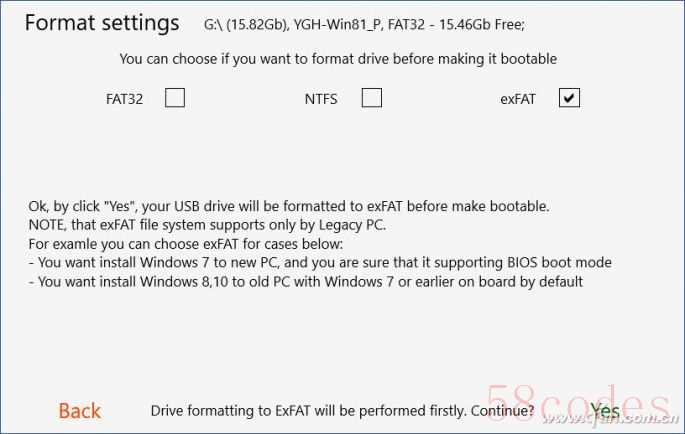 若选择了exFAT文件系统进行格式化,则该启动盘将只能支持传统BIOS启动模式,无法支持UEFI模式启动。