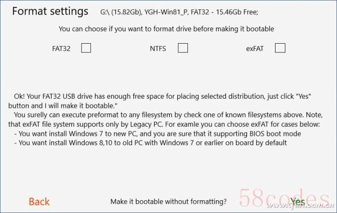点击Next之后,软件要求选择磁盘格式并进行格式化。如果介质中已经包含有一些数据,且剩余空间足够存放之前选择的系统映像文件,软件会给出空间足够的提示,这时我们就可以不选三种格式选项中的任何选项,不对介质进行格式化处理,点击右下角的Yes按钮直接开始安装盘的制作。