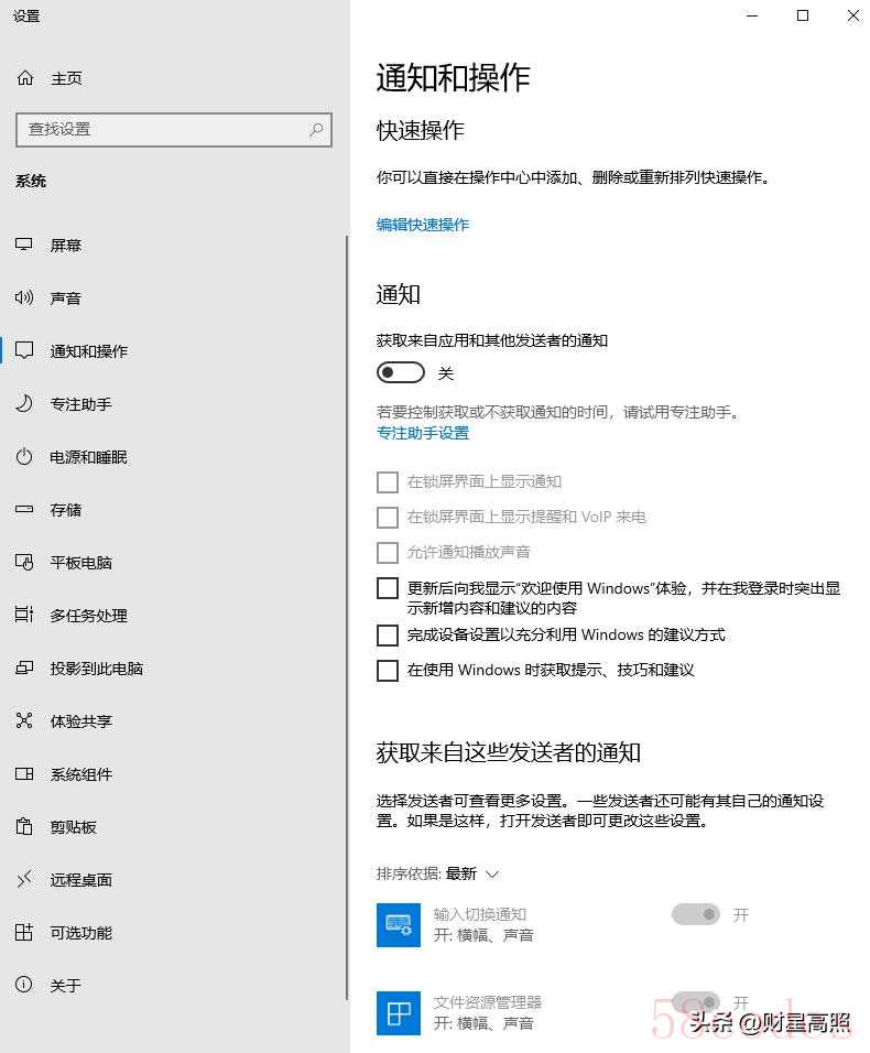 3、关闭通知和提示功能。在“控制面板”中找到“系统”,在设置界面左边找到“通知和操作”,在右边的界面中把通知功能关闭。