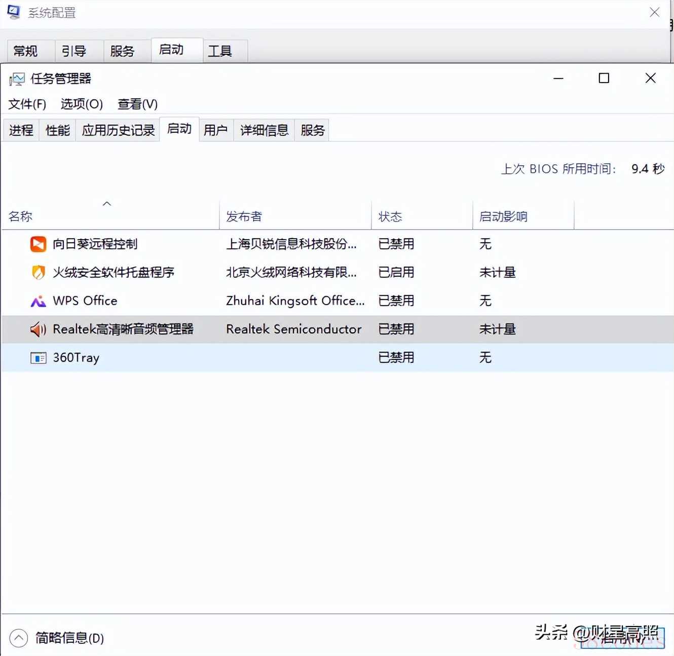 4、禁用不常用的启动项。按“WIN+R”,打开“运行”框,输入“msconfig.msc”,回车,弹出“系统配置”窗口,选择“启动”,在列表中将不常用的程序“禁用”。确定,重启电脑。这样可以大大提升开机速度。