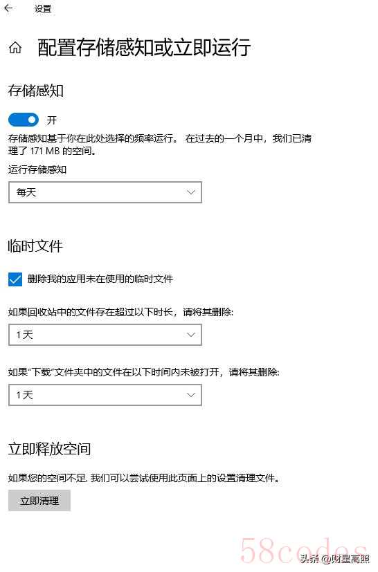 3、配置存储感知中立即清理可释放空间。在控制面板中找到系统,打开系统,在左边找到存储,在右边打开“存储感知”,并进入存储感知窗口。在最下面有“立即清理”功能。在这里可以设置运行存储感知的时间和删除临时文件的时间,可按自己需求设置。
