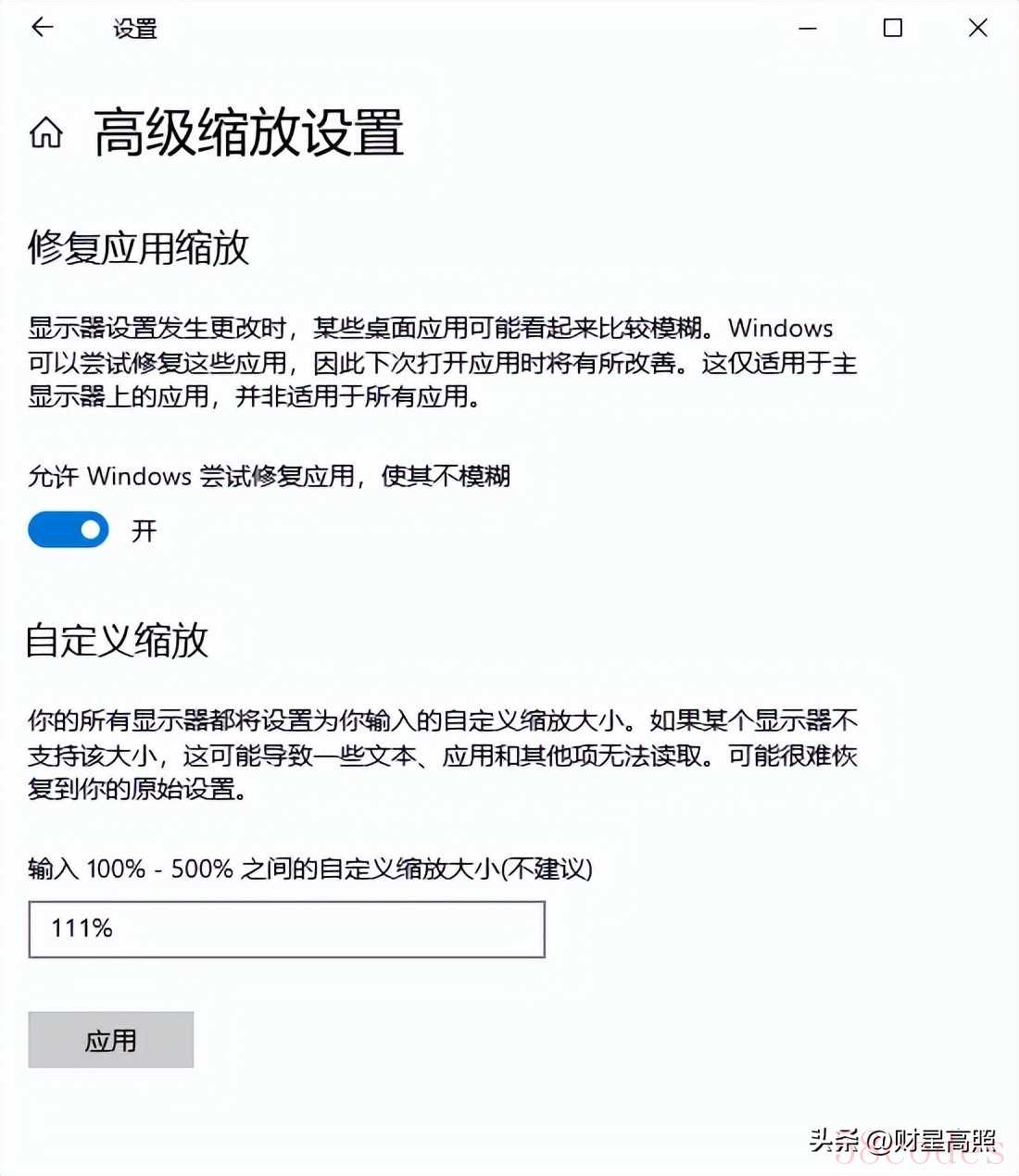 5、如果你觉得系统推荐的不适合自己,那么你可以设置自己喜欢的样子。在高级缩放设置里可以设置自己喜欢的缩放比率,自定义缩放比率范围100-500之间。低于100或高于500,应用都是灰色,无法点击应用。