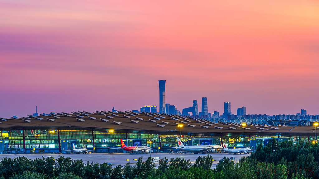 北京顺义区首都机场航站楼与CBD商务区同框。视觉中国 图