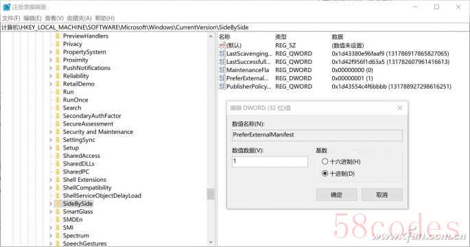 按Win+R组合键呼出界面,输入regedit并回车进入注册表编辑器,定位到HKEY_LOCAL_MACHINESOFTWAREMicrosoftWindowsCurrentVersionSideBySide。在右侧新建名为“PreferExternalManifest”的DWROD(32位)值,并将其数值数据设置为1,注意选择为10进制。