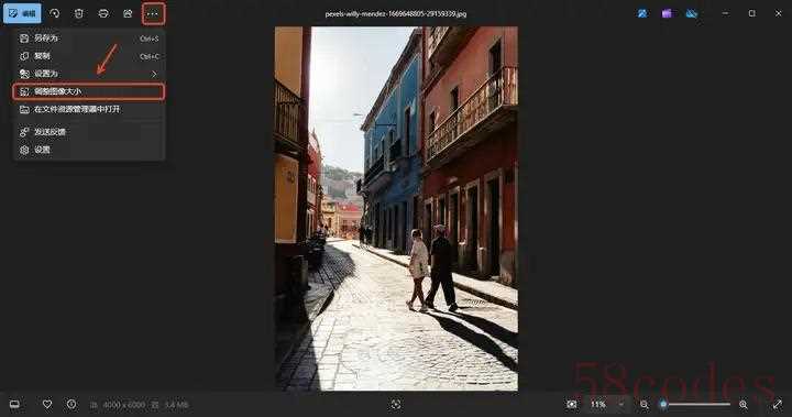 使用照片工具打开图片,选择三个点,点击【调整图像大小】。