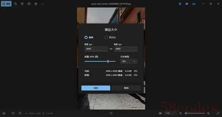 在重设大小界面中,可以根据像素和百分比的方式来修改图片,在编辑的同时,下方会实时显示当前和原始图片的体积,完成后保存即可