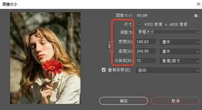 在图像大小界面中,可以自定义设置图片的尺寸、宽度、高度、分辨率等参数,如果想要在修改图片dpi的同时保存画质,可以取消勾选“重新采样”,完成后将图片保存即可。
