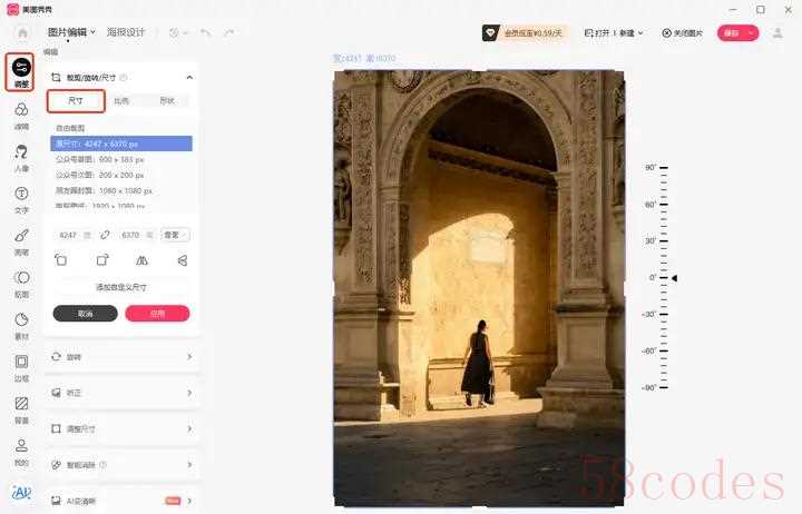 点击软件界面上方的【调整】,找到【尺寸】,在尺寸设置界面中,可以找到与dpi相关的设置并进行调整,完成后点击右上角的【保存】即可。