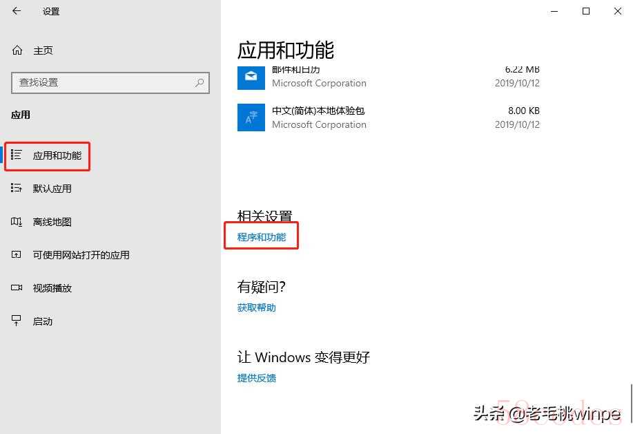 第三步:在窗口左侧点击【应用和功能】,然后在下拉窗口右侧的菜单,找到【程序和功能】并点击打开