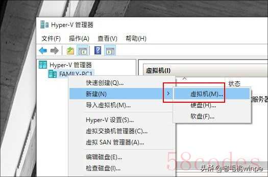 第六步:接下来我们打开Hyper-V管理器,在搜索框输入即可调出。右键点击,选择【新建-虚拟机】