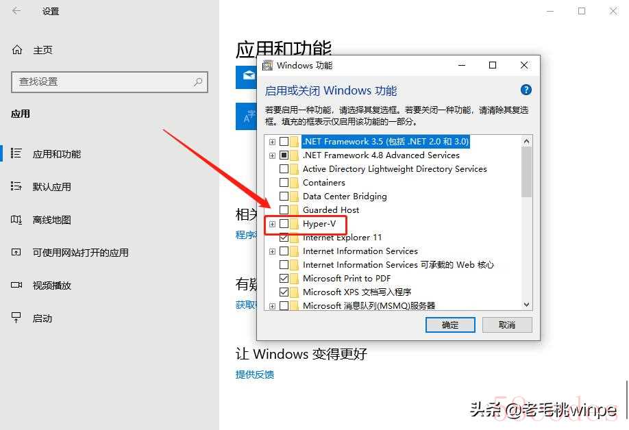 第四步:在弹出的窗口中勾选【Hyper-V】,win10就会自动安装程序组件