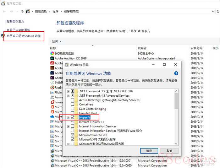 所有工作准备完毕,就可以安装虚拟机了。具体方法是:点击“设置”→“应用”,再点击右上角的“程序和功能”,然后通过“启用或关闭Windows功能”勾选其中的“Hyper-V”即可。稍等片刻,Win10会自动完成组件安装。重启电脑后,虚拟机便安装好了。