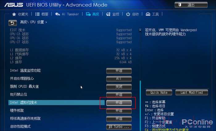 前两个好说,测试软件就能搞定,第三个则需要进入BIOS确认。一般是在CPU高级设置里,打开“Intel虚拟化技术”或“Intel Virtual Technology”(VT)前面的复选框即可。不过需要说明的是,并非所有的CPU都支持虚拟化技术,具体的就要因人而异,或者进入CPU厂商网站查询了。