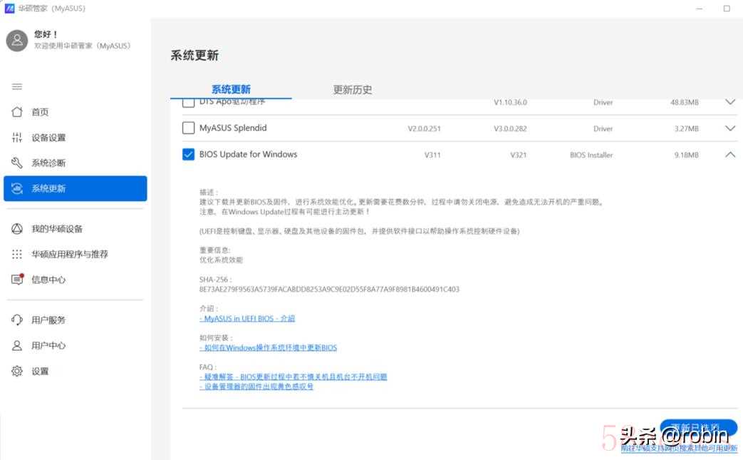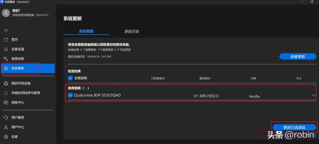 3.部分【BIOS Update for Windows】文件还会推送到华硕管家MyASUS。仍然是在连接电源后,搜索打开【华硕管家(MYASUS)】【系统更新】,在【系统更新】中勾选【BIOS Update for Windows】(ARM架构设备为【BSP】组件)并更新已选项,也可以更新BIOS。