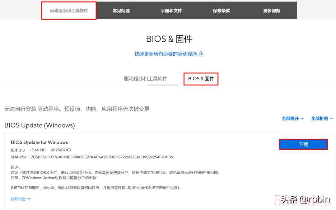 操作步骤1.到 ASUS官网支持页面 搜索对应机型,在【驱动程序和工具软件】【BIOS & 固件】中下载【BIOS Update (Windows)】(ARM架构设备为【Support Package】)文件。