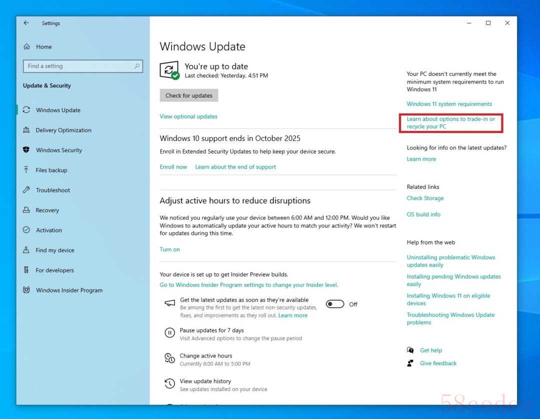 打开 Win10 的系统更新页面,除了熟悉的 “检查更新”,现在多了两个新按钮:一个是 “立即注册” 扩展更新服务,另一个就是刺眼的 “回收或更换电脑” 选项。点击回收按钮后,会跳转到微软商店的回收计划页面,这里提供两种选择:要么折价换购新电脑,要么免费 “环保回收” 旧设备。