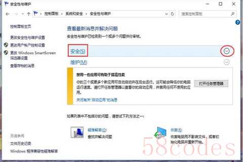 3.接着,进入“安全性与维护”的页面后,点击“安全”向下的箭头图标;