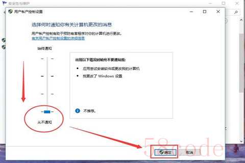 - 如果你希望完全取消 UAC,可以将滑块移动到最底部,然后点击“确定”。