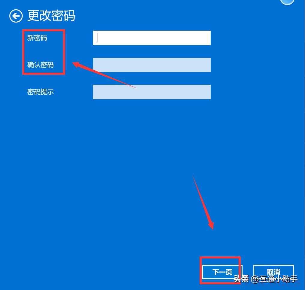 7、进入更改密码界面,将新密码、确认密码留空白,点击“下一步”。