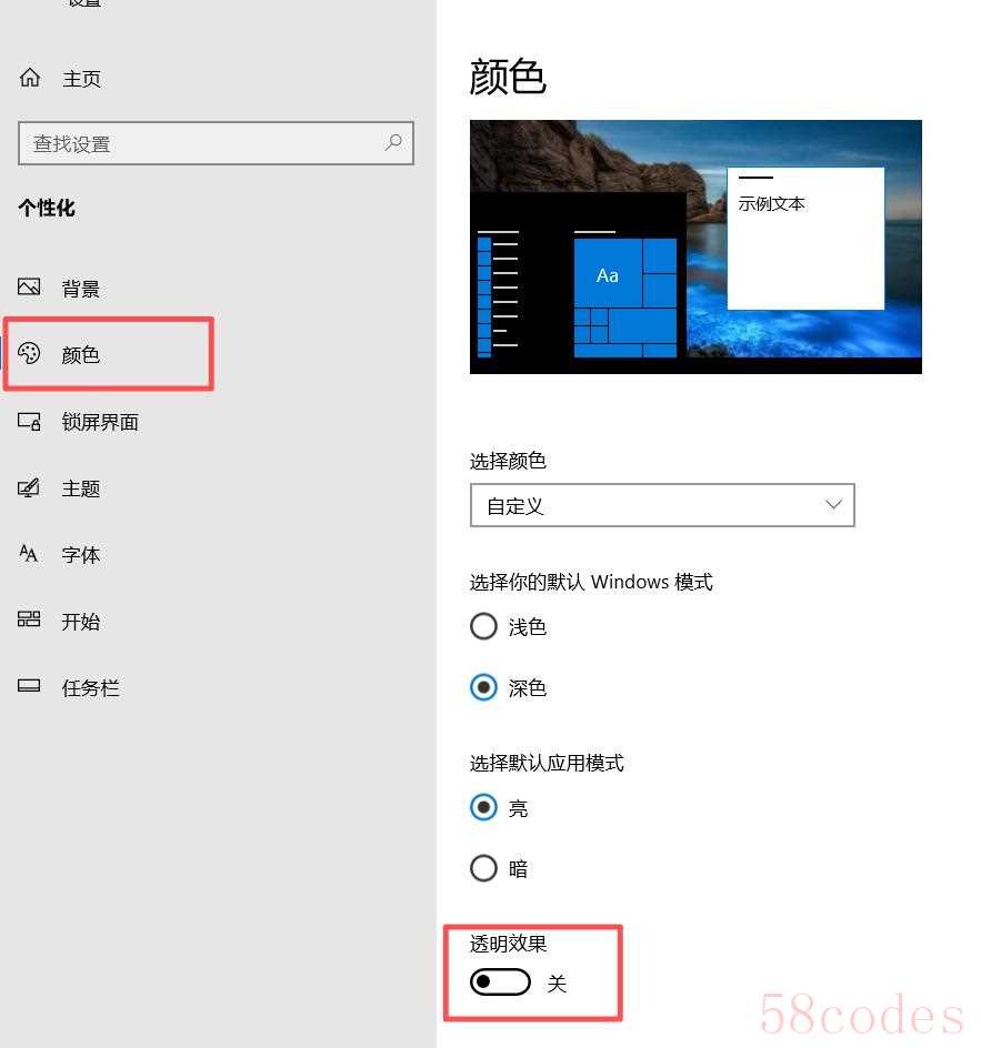 然后打开颜色》关闭透明效果,这样就不会透明桌面的图标了