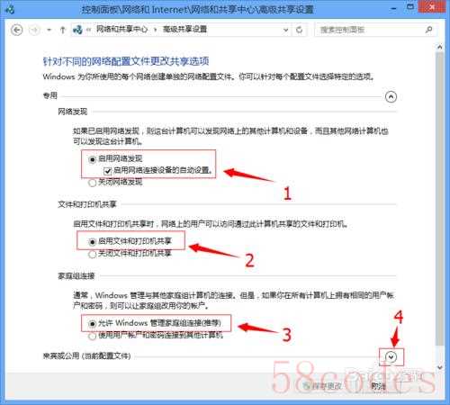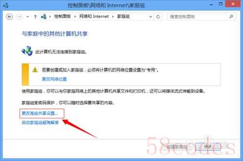 打开"这台电脑"——"计算机"——“打开控制面板”——“选择家庭组和共享选项“——”更改高级共享设置“